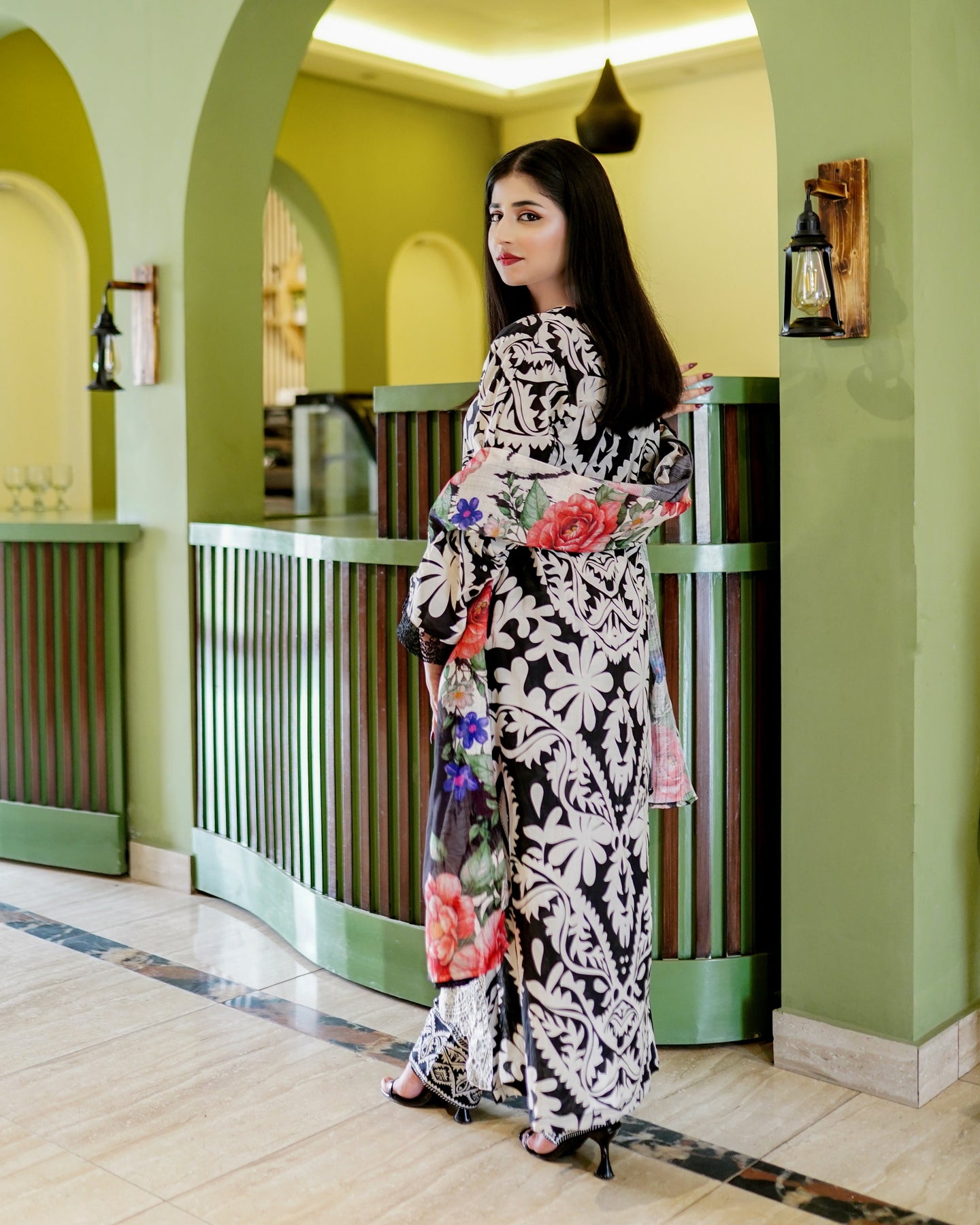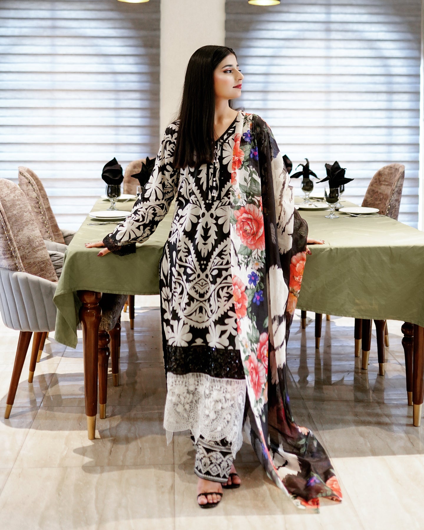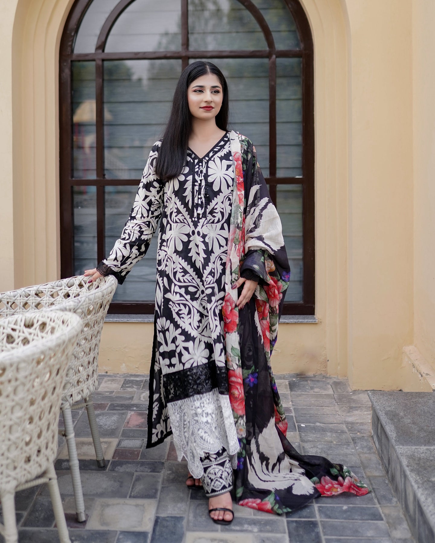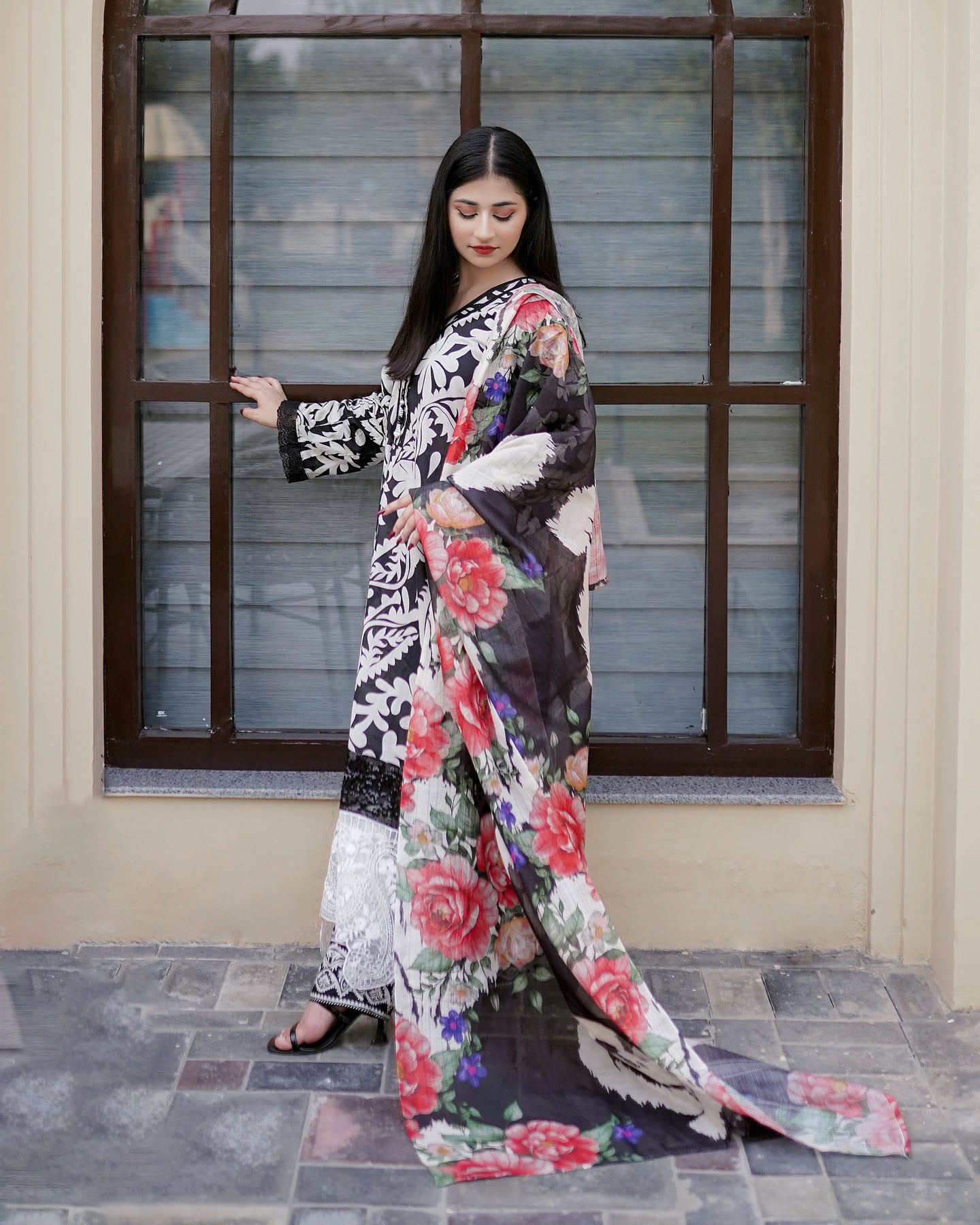 Our fabric is crafted from 100% pure cotton lawn, celebrated for its lightweight, breathable, and luxuriously soft nature. With its fine, smooth texture and graceful drape, this fabric offers effortless elegance while ensuring all-day comfort. Designed to keep you cool and fresh in warm weather, it blends timeless sophistication with natural ease, making it a perfect choice for both everyday wear and special occasions.