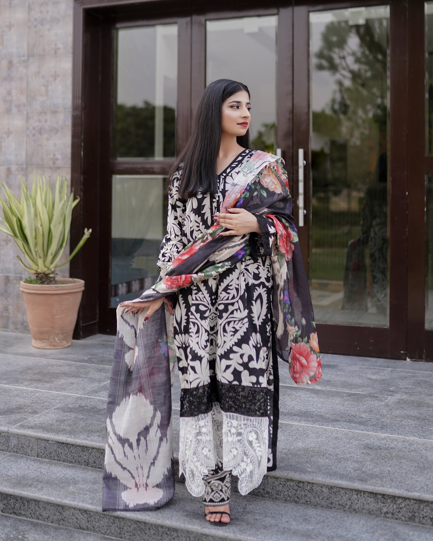 Refresh your summer wardrobe with our Serenity 3-Piece Suit, a beautifully designed ensemble crafted from premium cotton lawn. Rooted in traditional Pakistani elegance, this occasion-ready outfit blends timeless charm with modern sophistication. The soft pastel peach hue brings a breezy vibrance, while the lightweight, breathable fabric ensures all-day comfort.