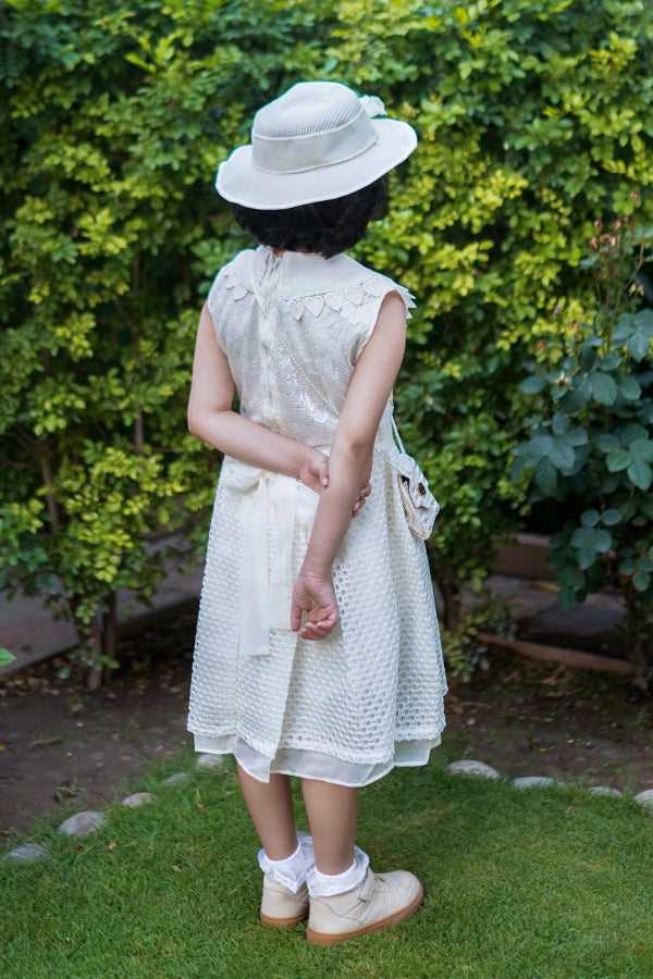 The soft pastel peach shade adds a delicate and graceful flair, while the lightweight net fabric ensures comfort and breathability. Designed with thoughtful embroidery, the Serenity Frock captures the innocence of childhood with a hint of timeless sophistication.