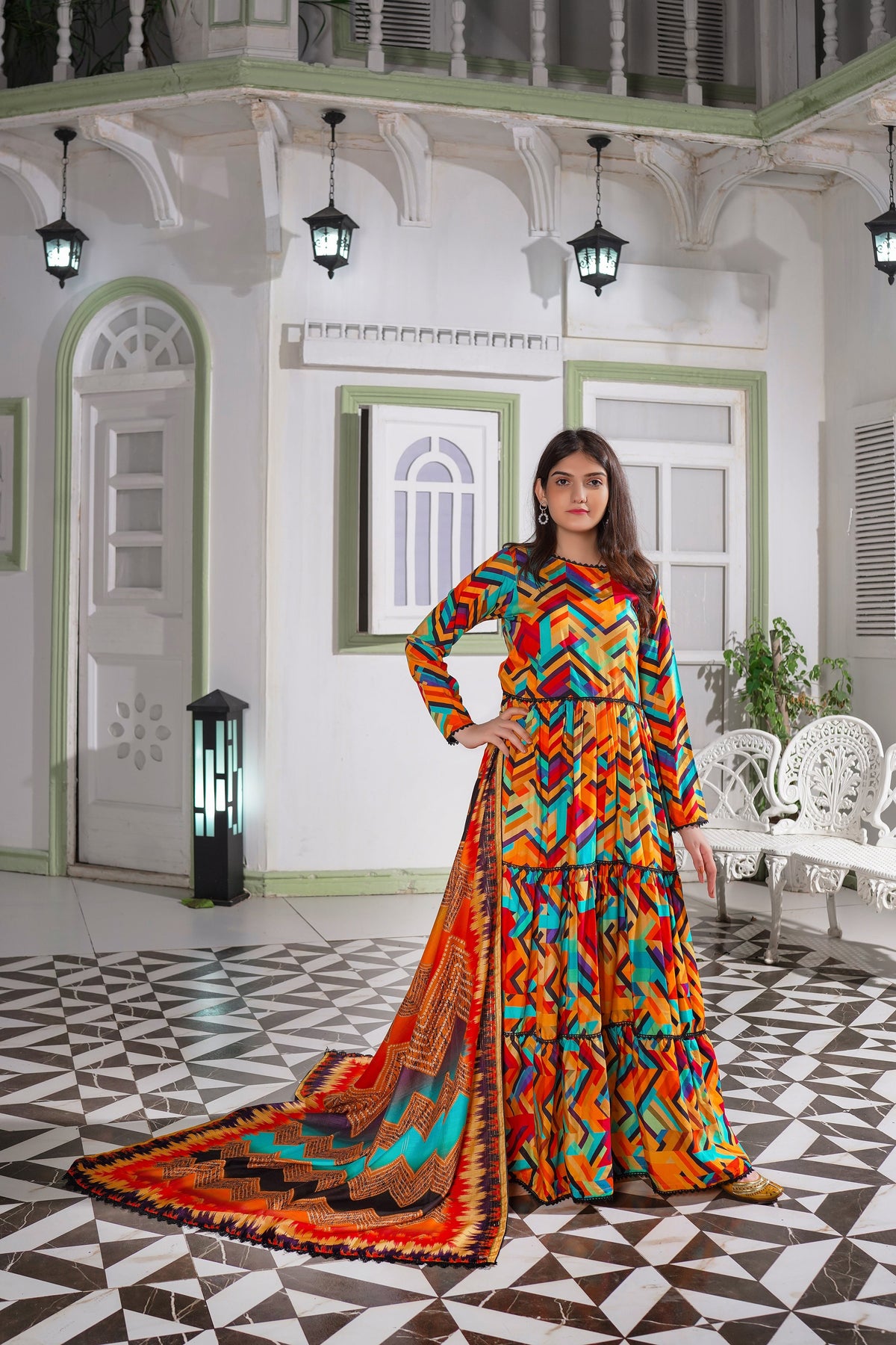Trousers: Matching all-over printed trouser, also measuring 2.5 meters in length.