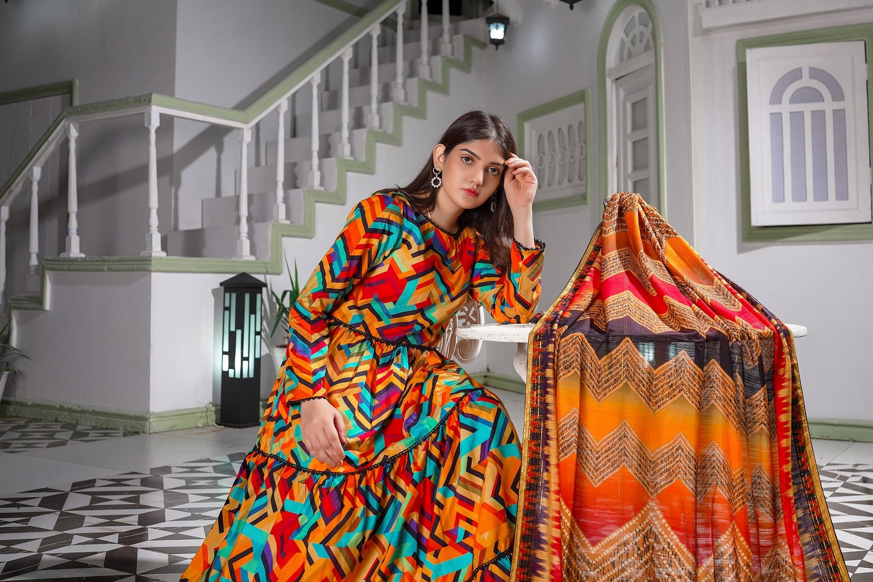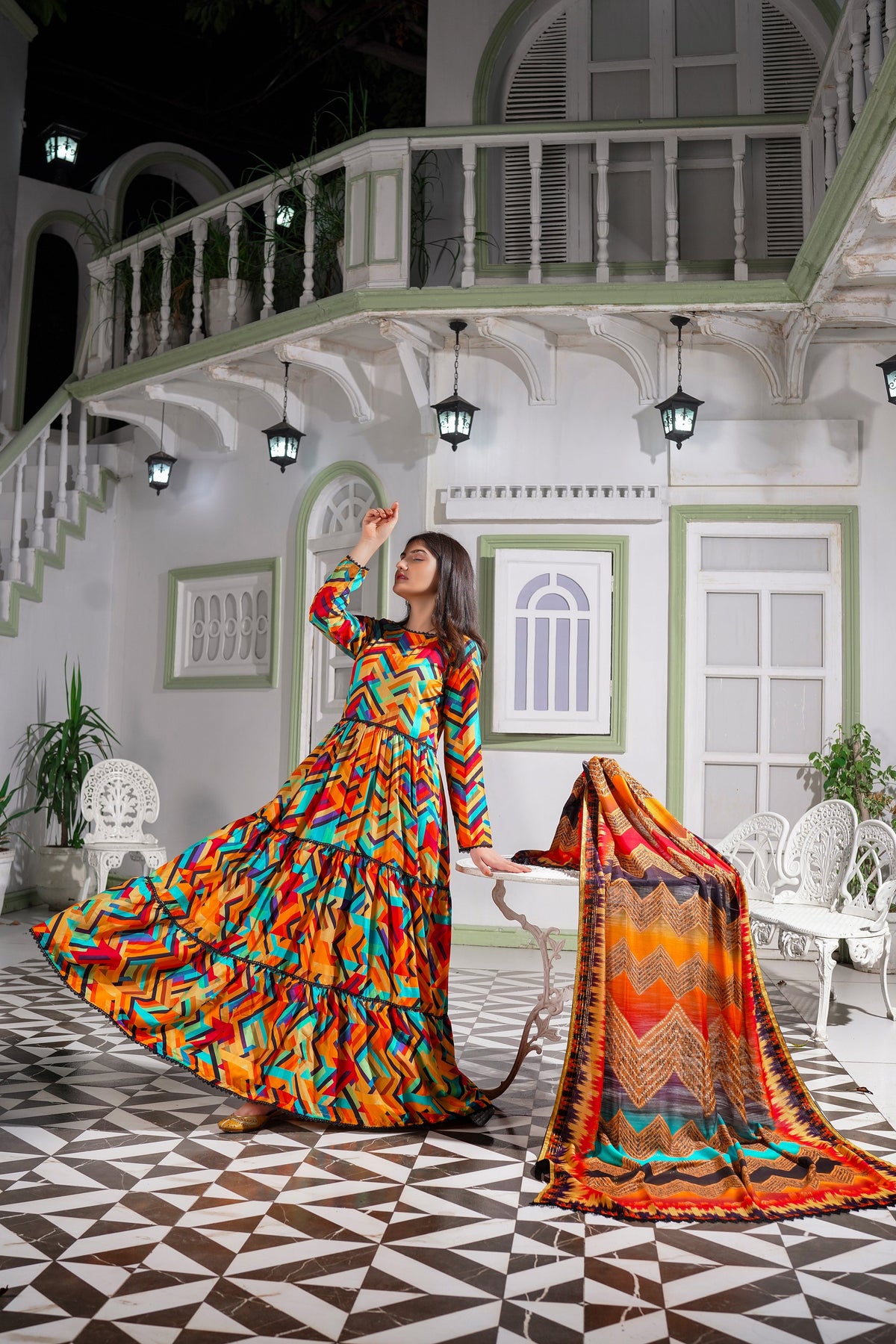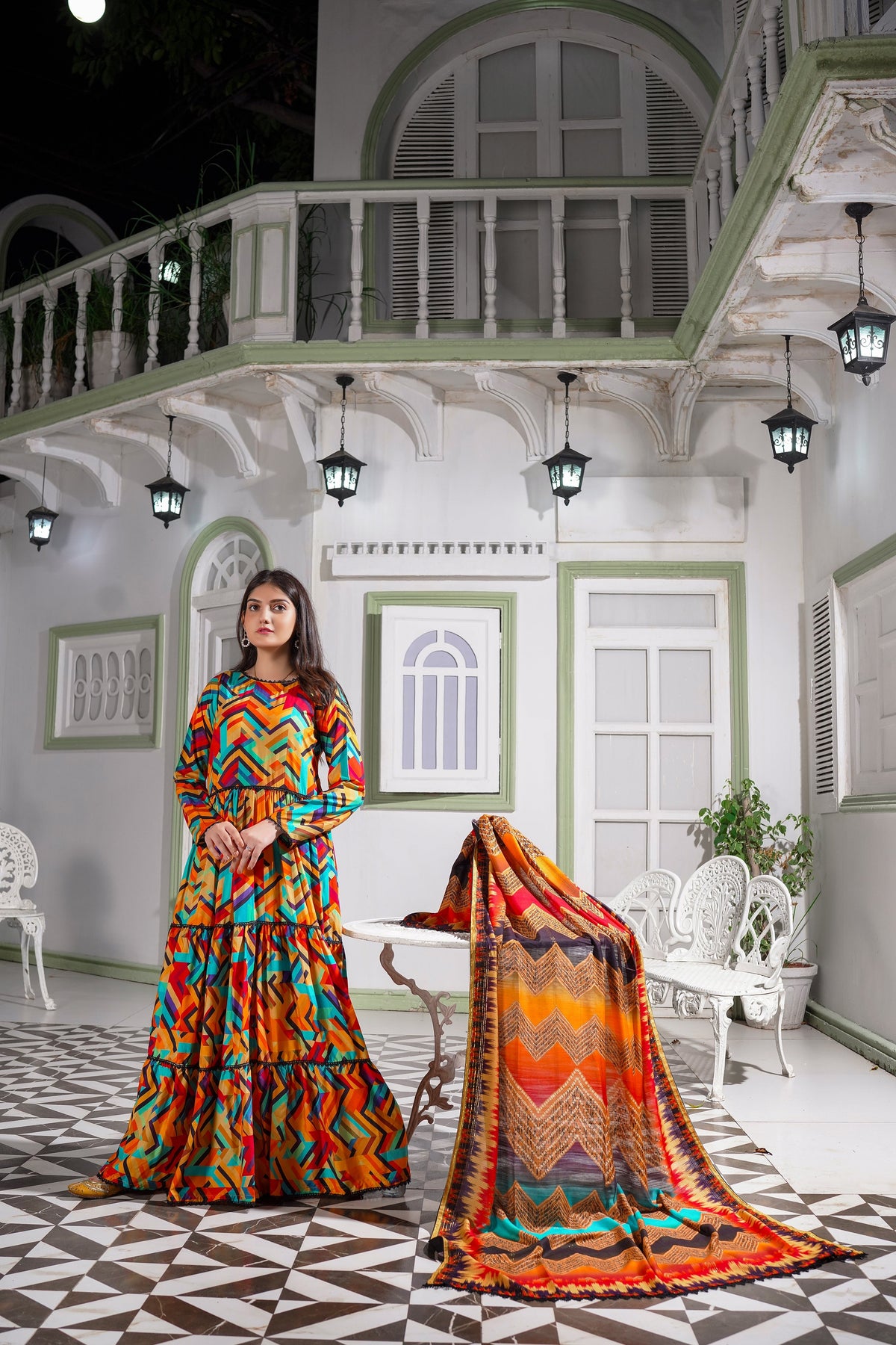 The MH Branded Luxury Korean Fancy Linen Suit, a three-piece ensemble, showcases a captivating blend of colors with intricate all-over prints. To complete the look, it includes a sophisticated fancy linen dupatta.